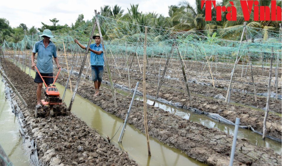 Nông dân Trương Công Thành, ấp Bót Chếch, xã Lương Hòa tận dụng diện tích đất trồng dưa leo vừa thu hoạch để cải tạo, xử lý đất xuống giống vụ dưa leo mới.