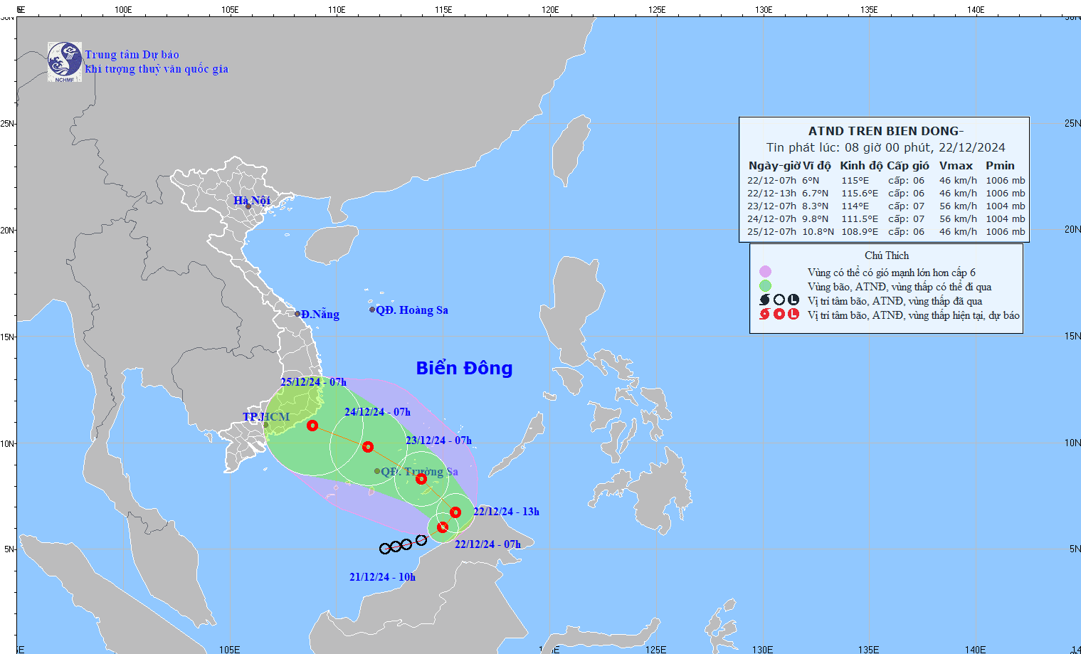 Theo Trung tâm Dự báo khí tượng thủy văn quốc gia, hồi 7 giờ ngày 22/12, vị trí tâm áp thấp nhiệt đới ở vào khoảng 6,0 độ vĩ bắc; 115,0 độ kinh đông, trên vùng biển phía Nam của khu vực Nam Biển Đông. Sức gió mạnh nhất vùng gần tâm áp thấp nhiệt đới mạnh cấp 6 (39-49km/giờ), giật cấp 8. Áp thấp nhiệt đới di chuyển theo hướng Đông Bắc, tốc độ khoảng 10km/giờ.
